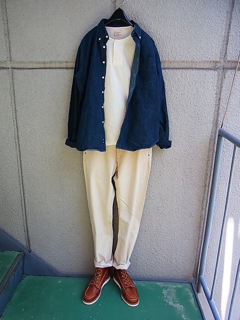 本日のセットの主役のナショナルアンセムのスラブデニム地使用のボタンダウンシャツ