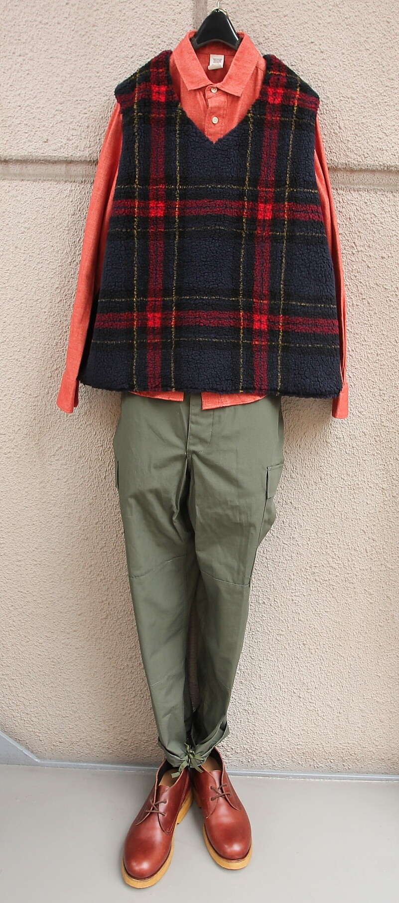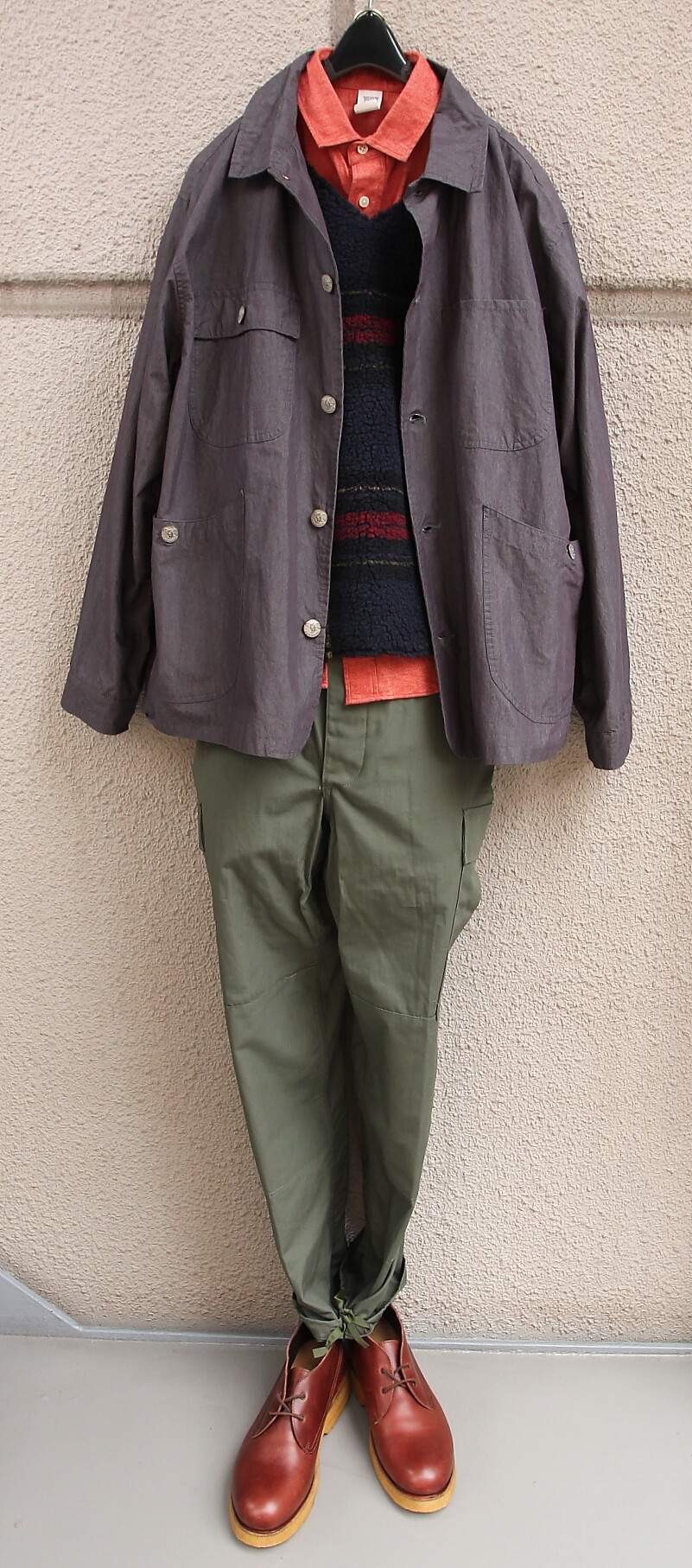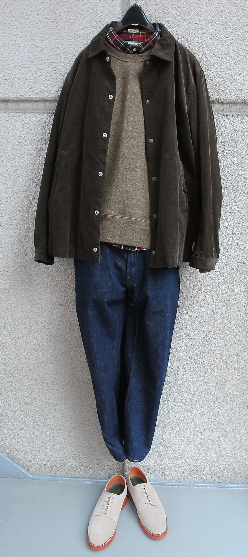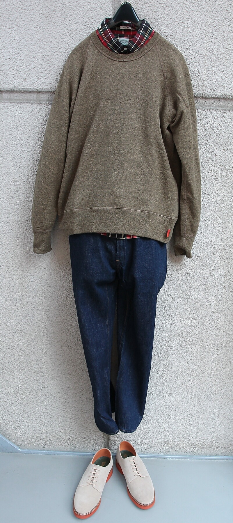 足元は Milton Keynes スエード Uチップシューズ。