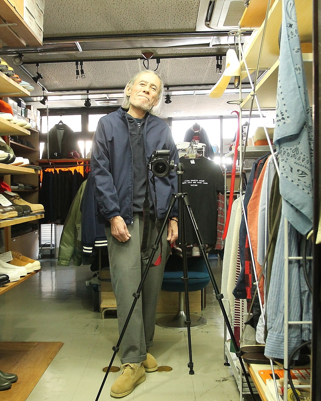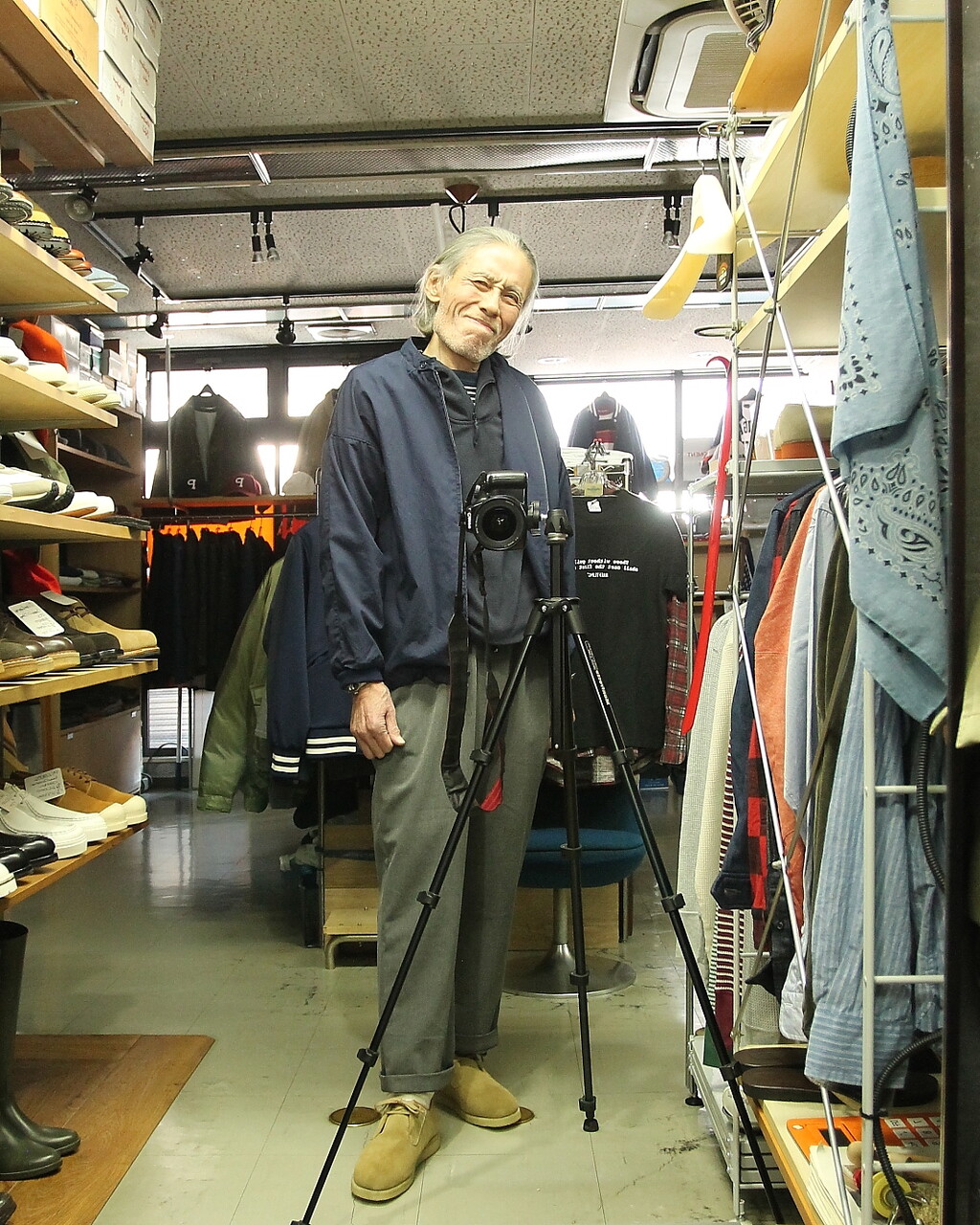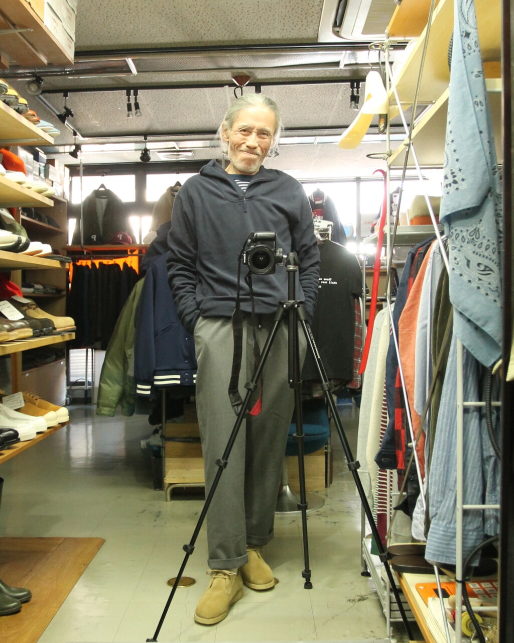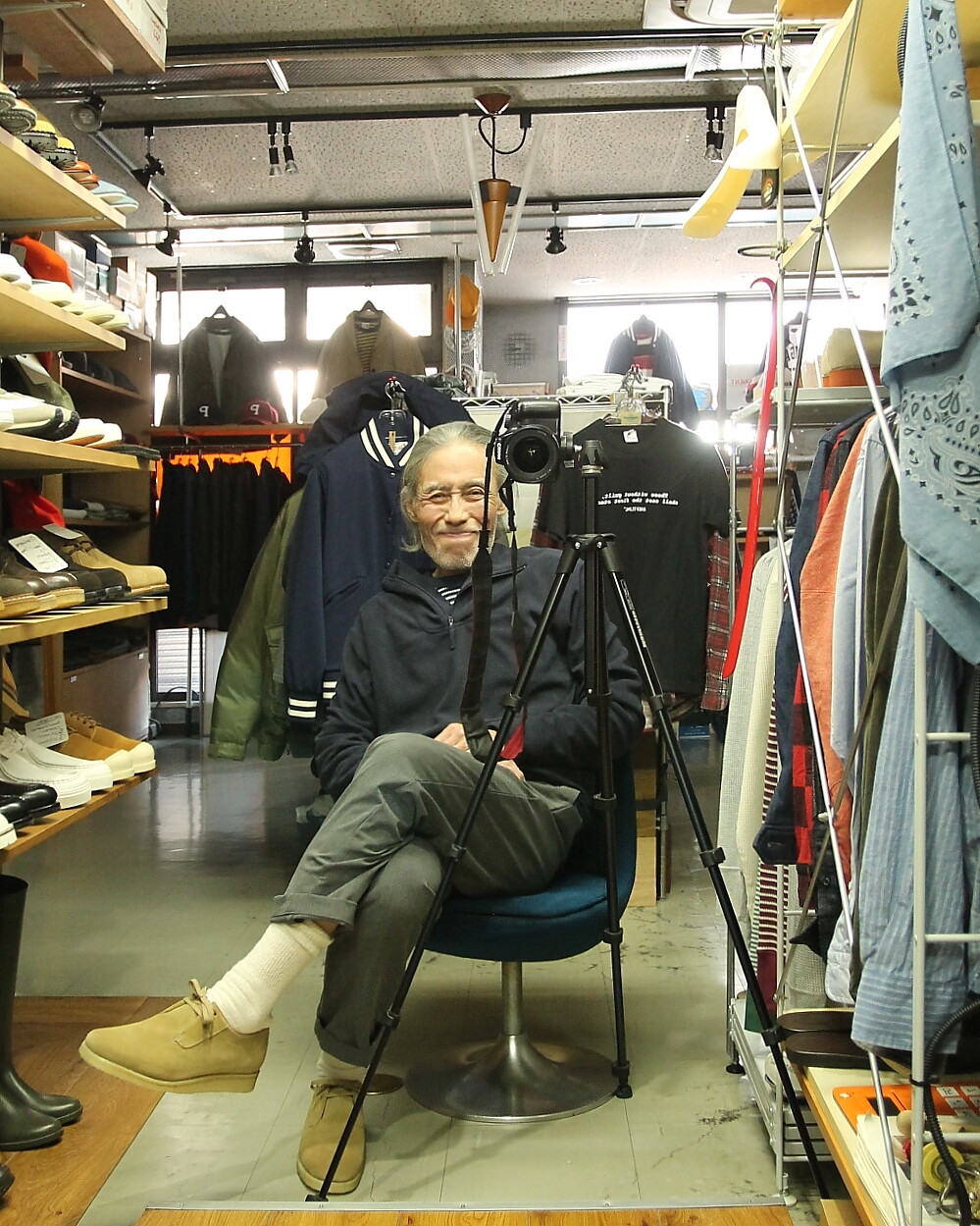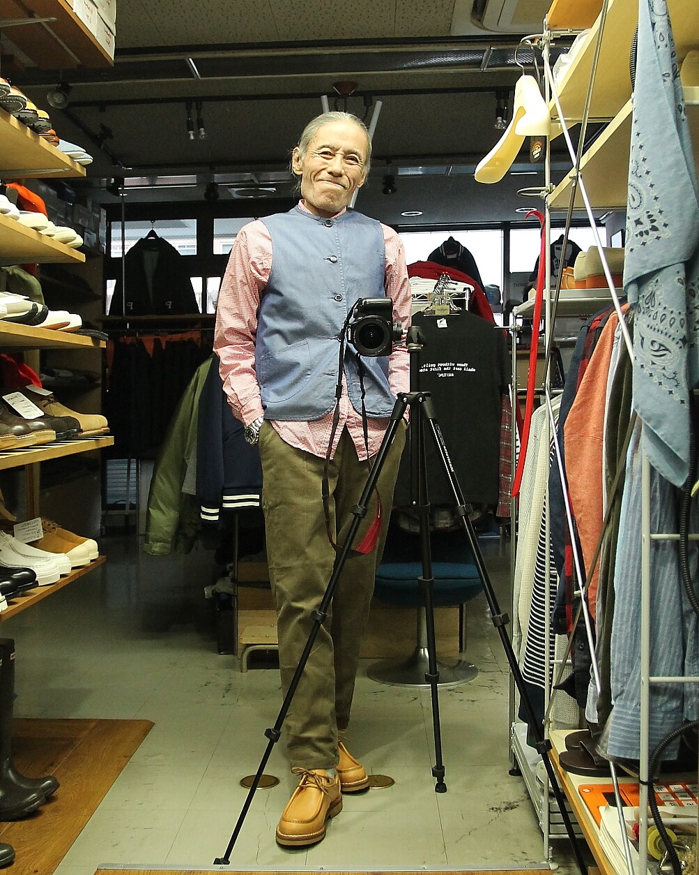足元は Milton Keynes スエード Uチップシューズ。